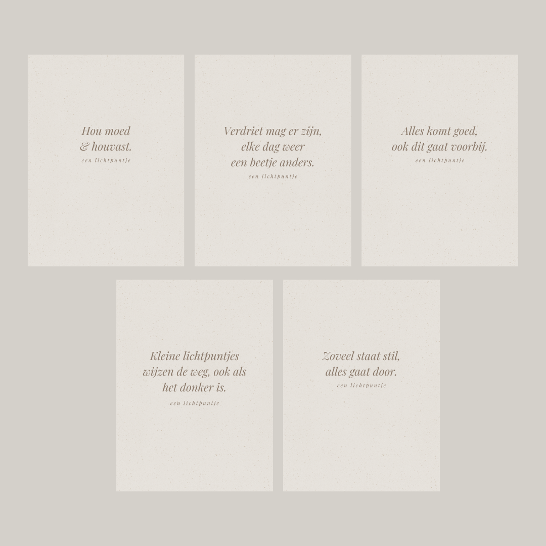Wanneer alles donker en zwaar voelt, je niet goed weet wat te zeggen, zorgt dit mooie setje voor wat extra licht & warmte. Deze set kan troost bieden bij verlies, bemoediging tijdens ziekte of een andere moeilijke periode.