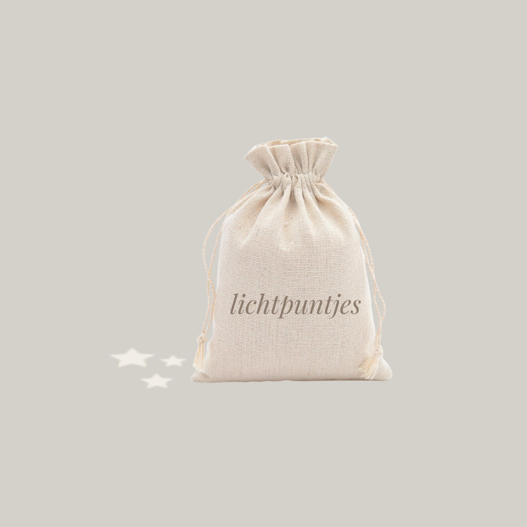 Het set bestaat uit een katoenen zakje met tekst, een houten kaarthouder, 5 kaartjes met bemoedigende woorden en een zakje met 45 papieren sterretjes.