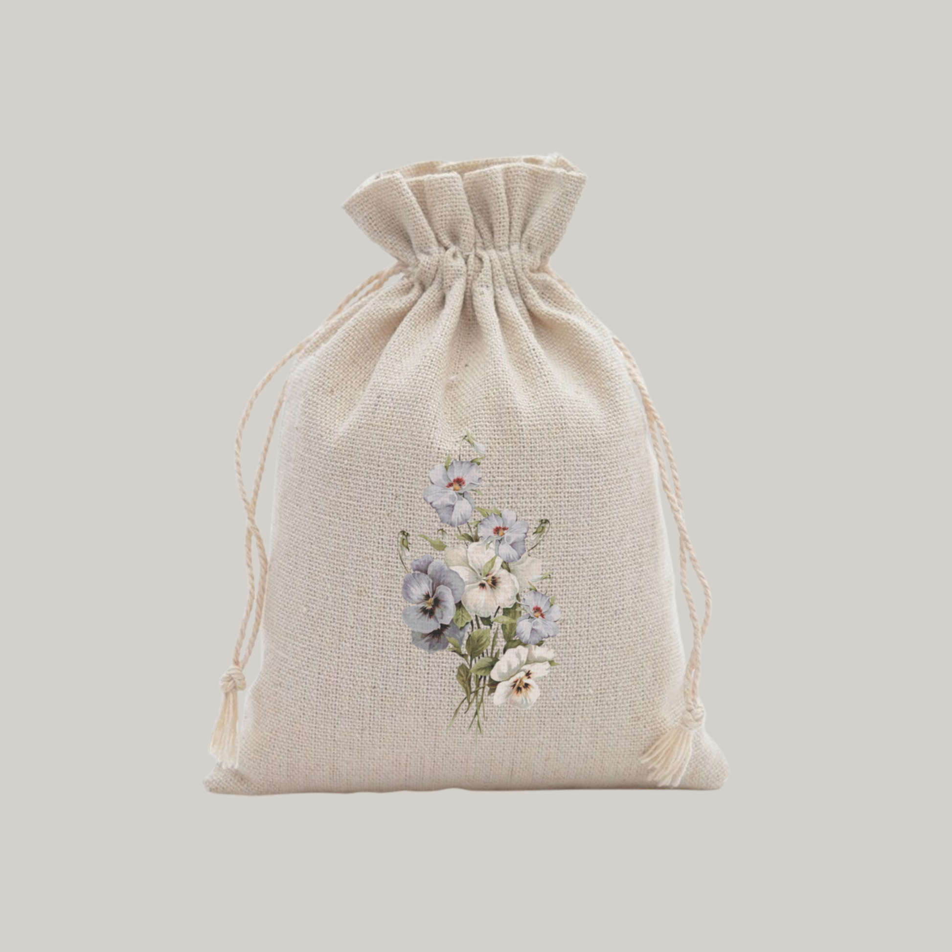 Gebruik dit katoenen zakje om kleine cadeautjes te verpakken, je eigen adventskalender samen te stellen, doopsuiker te presenteren of om je favoriete kleine spulletjes op te bergen. De print werd handmatig aangebracht d.m.v. een hittepers.