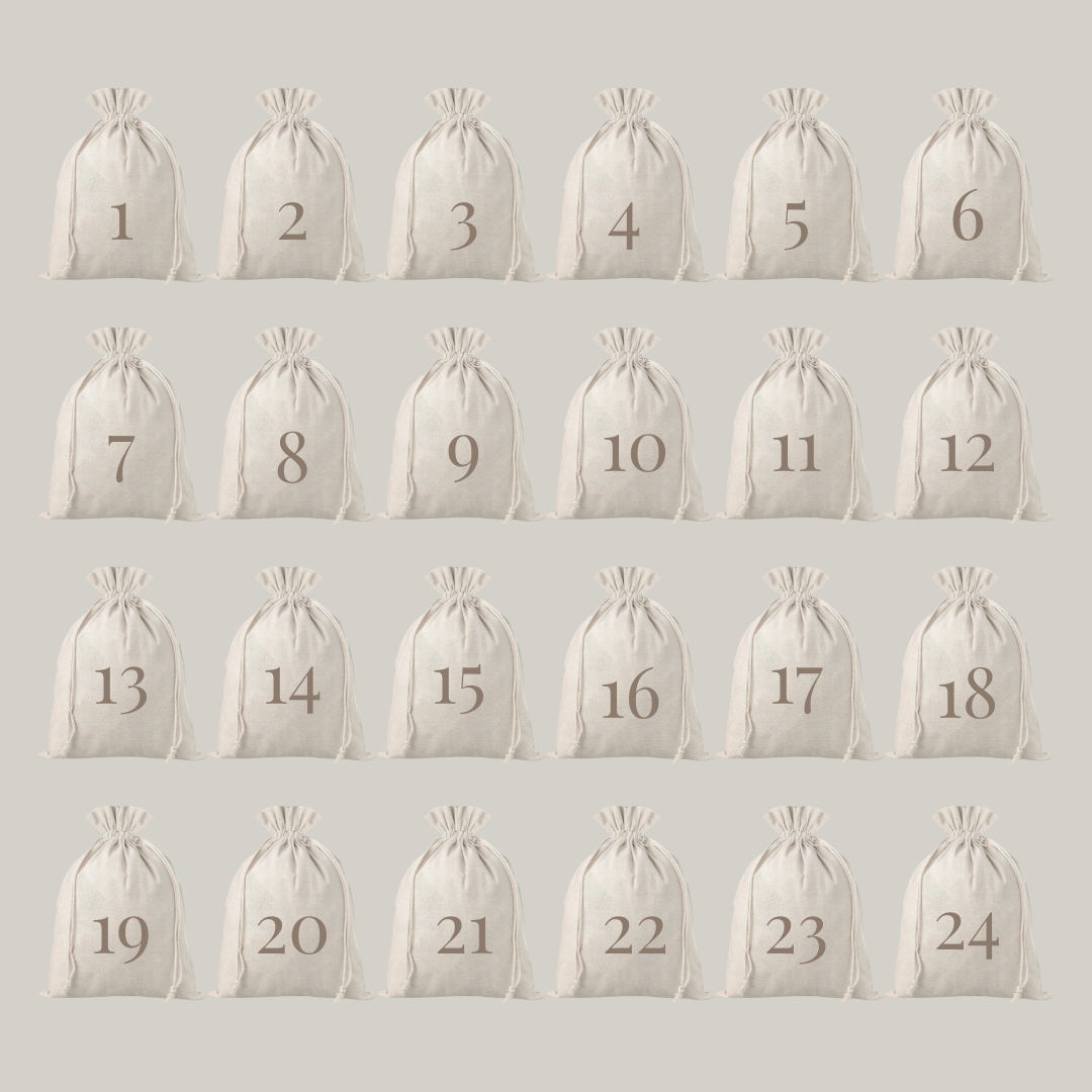 Gebruik deze set van 24 katoenen zakjes, genummerd van 1 tot en met 24, om je eigen persoonlijke adventskalender te maken - eentje die helemaal past bij jou en je familie.